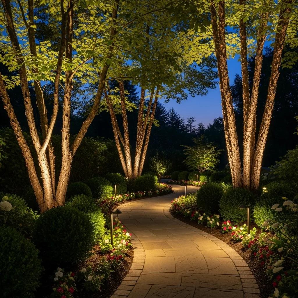 | Uplighting | Ground fixtures aimed at trunks or façades | Accent trees and architectural details for dramatic contrast |