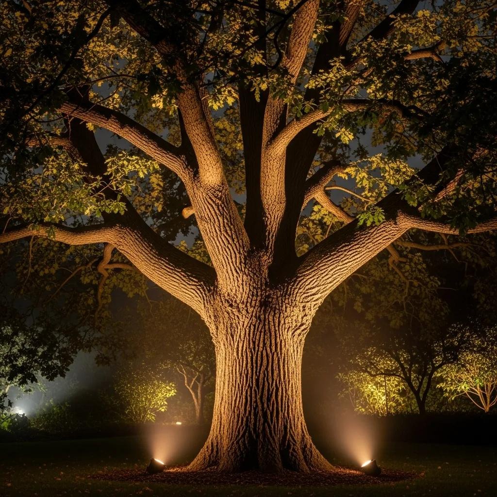 LED spotlights and recessed well lights work well for controlled uplighting. Aim to place lights roughly one-third to halfway up the height of the tree or structure to achieve balanced illumination. Avoid placing a fixture flush to the trunk; backing it off a bit softens shadows. Layering two or three fixtures on a single specimen can add dimension and prevent a flat look. Learn more about Types of Landscape Lighting.