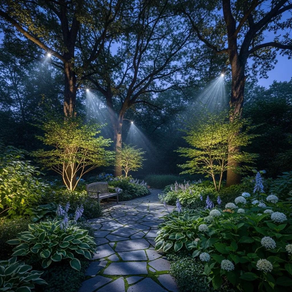 Choose LED fixtures for long life and energy savings. Place lights at varying heights and angles to build depth — a low well light for groundcover, a mid-height fixture for shrubs, and a higher spotlight for trees or sculptures. Space fixtures to avoid dark gaps and minimize overlap for an even, cohesive look.