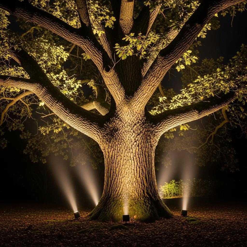 For trees, place fixtures at the base and angle them to show trunk lines and branch structure — that creates dramatic silhouettes and layered shadows. For buildings, use uplights to emphasize texture and architectural details. Choosing warm-color LEDs helps keep the scene inviting instead of harsh.